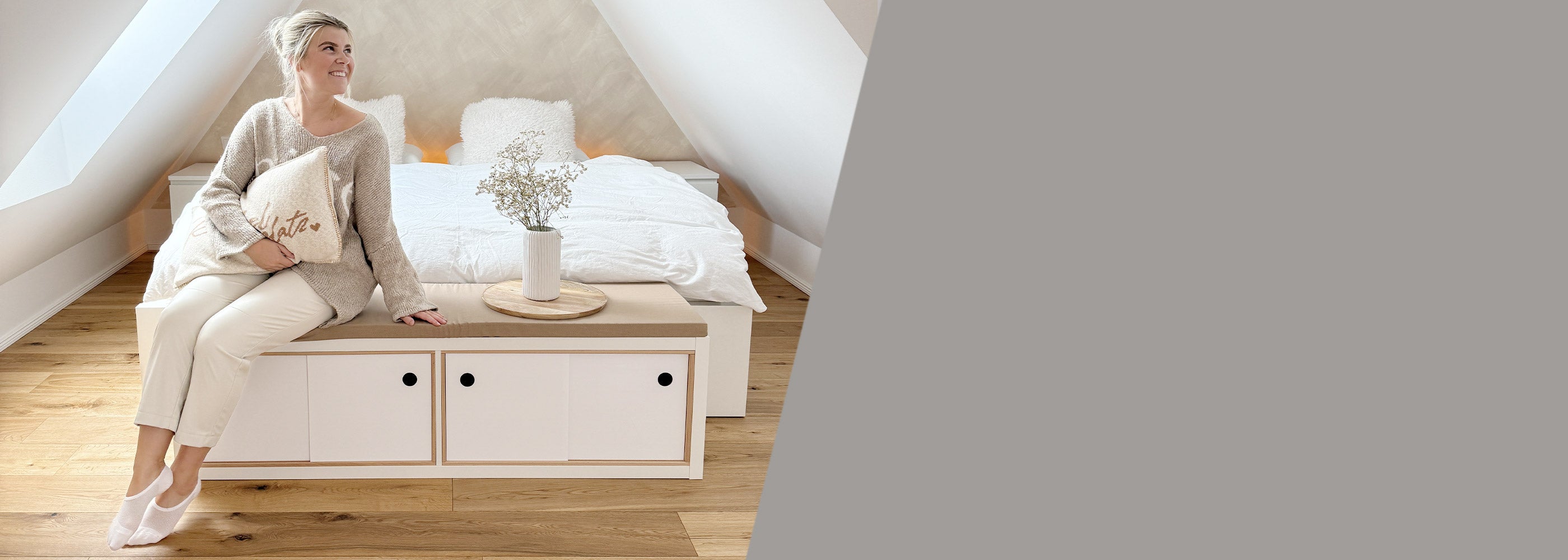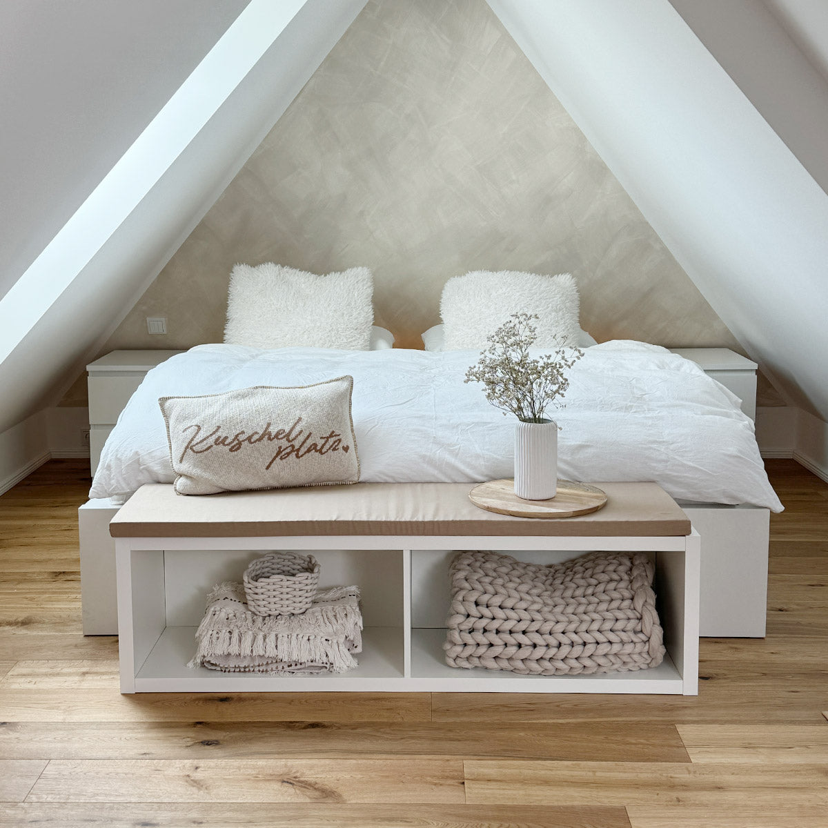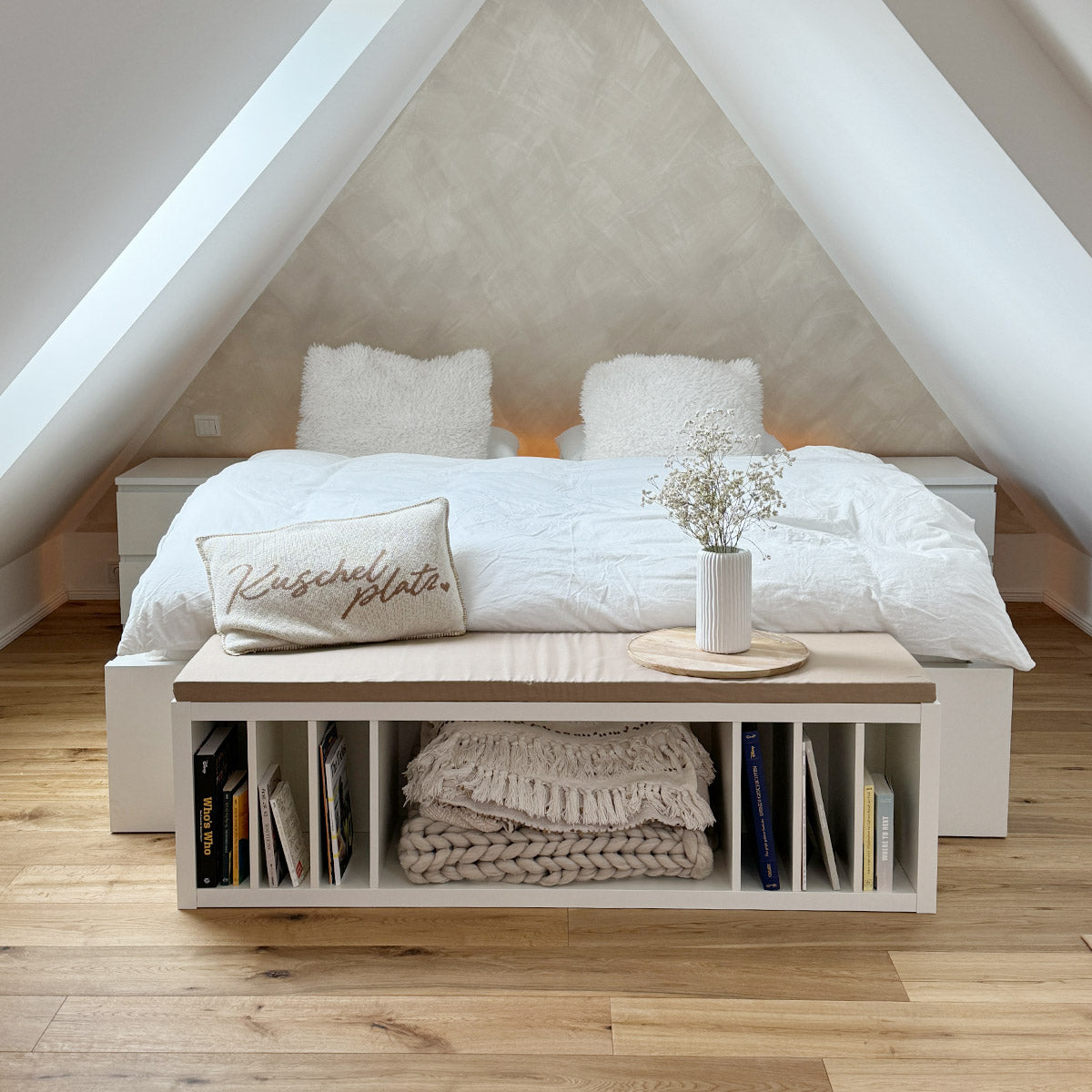 Ohne Trennwand im Kallax hat auch eine riesengroße Kuscheldecke Platz! Die beigefarbene Sitzauflage erzeugt einen einladenden Ort zum Verweilen und Schmökern.