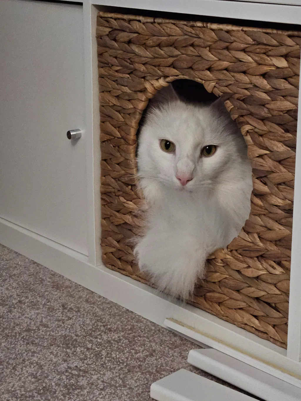 Ein Tipp: Katzen schlummern gern in höheren Ebenen. Schiebe den Korb einfach 1 - 2 Regalebenen nach oben. Vermutlich wird dein Vierbeiner elegant darin landen und den Blick von dort aus genießen.